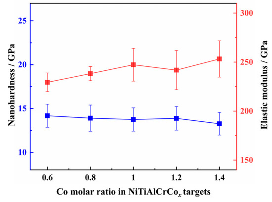 Figure 6 shows the average nanohardness and the elastic modulus of NiTiAlCrCoxN films. With the increase in Co content, the nanohardness of the NiTiAlCrCoxN films decreases and the elastic modulus of the NiTiAlCrCoxN films increases, expect for the ones of the NiTiAlCrCo1.2N film. When the Co molar ratio is 1.4, the film has a minimum hardness of 13.264 GPa and a maximum elastic modulus of 253.22 GPa. When the Co molar ratio is 0.6, the film has a maximum hardness of 14.178 GPa and a minimum elastic modulus of 229.40 GPa.