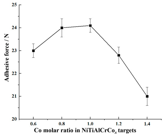 Figure 7 shows the adhesive force of NiTiAlCrCoxN films. The adhesive force firstly increases and then decreases with the increase in Co content. When the Co molar ratio is 1.0, the film has a maximum adhesive force of 24.2N. The reason is that AlN, TiN and CrN are concentrated near the substrate and have a better adhesive force with a TiN transition layer.