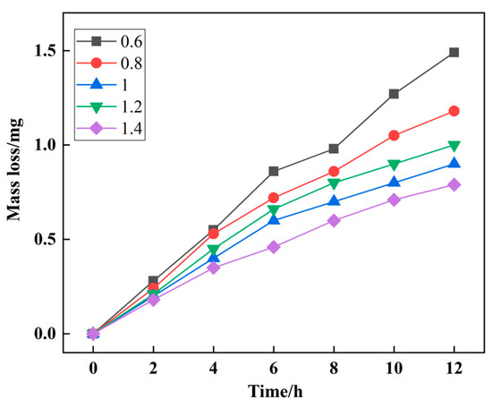 Figure 8 shows the relationship between the mass loss and the cavitation erosion time of NiTiAlCrCoxN films with different Co contents. The mass loss increases monotonically with the cavitation erosion time. The accumulative mass loss firstly decreases and then increases with the increase in Co content. When the Co content has a molar ratio of 1.4, the accumulative mass loss is the minimum of 0.72 mg and the cavitation erosion rate is of 0.12 mg/h.
