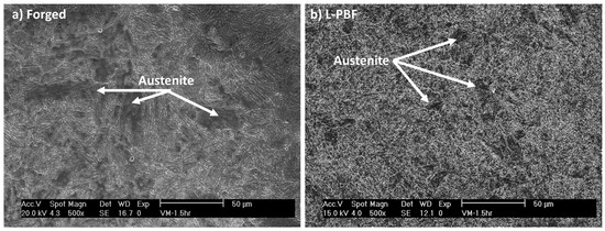 A representative microstructure of the forged and additively manufactured samples after H900 heat treatment and etching with Fry’s reagent are shown in Figure 2. Fine martensite grains and austenitic structures located at the grain boundaries are observed. These observations are consistent with other bibliographic reports, where it has been shown that due to the rapid cooling of the L-PBF process, it is possible to obtain retained austenite at the grain boundaries [30,31,32]. However, the refinement of martensite grains due to heat treatment was more homogeneous in the material obtained by AM than in the forged material. This is evident, as the austenite grains observed in Figure 2a are larger, irregular, and more abundant compared to those observed in Figure 2b. This effect is caused because the additive manufacturing process melts material selectively, with high cooling rates, which can cause the distribution of alloys to not be distributed homogeneously in the material [29,30,31,32,33]. However, it is observed that the obtained microstructures are equivalent.