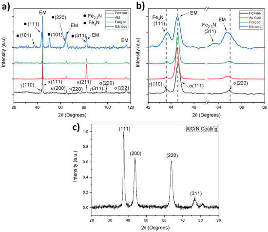 Grazing incidence X-ray diffraction patterns for (a) 17-4 PH SS powder, 3D-printed sample, forged sample, and plasma-nitrided sample; (b) zoomed in view of peaks between 42 and 68°; and (c) AlCrN coating deposited by cathodic arc.