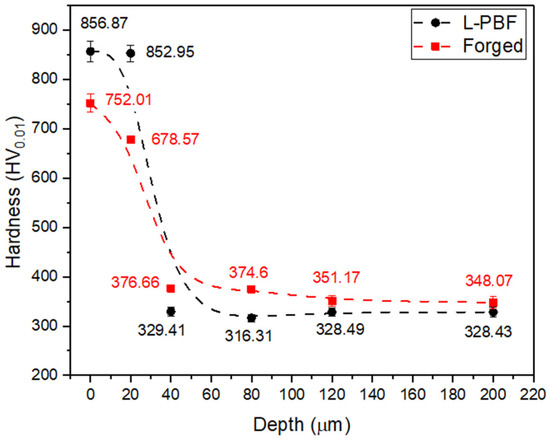 Figure 5 shows the hardness profile obtained from the nitrided 3D-printed 17-4 PH steel and the forged steel cross-section. An increase of ~2.5 times in hardness was achieved in the outer zone (~26.5 µm), with a maximum value of 857 ± 20 for the L-PBF and 752 ± 18 HV0.01 for the forged steel, which agree with the nitrided region (Figure 4a,b). Subsequently, a sudden decrease in hardness is observed until the average values of the 3D-printed 17-4 PH steel (328 ± 8 HV) and the forged steel core (348 ± 12 HV) are reached. The higher bulk hardness of the steel that is obtained by forging in comparison with the steel obtained by additive manufacturing is due to the differences in microstructure that can be observed in Figure 2. Furthermore, the hardness of the c-AlCrN coating obtained by nanoindentation was 15.63 GPa (~2897 HV), and the elastic modulus was 415.58 GPa. These results showed that with the DUPLEX treatment, the surface hardness increases more than two times with respect to the nitriding case and ~nine times concerning the steel substrate, which agrees with reports in the literature on similar treatments [39,40,41]. The microstructure and hardness measurements allow us to state that through the DUPLEX treatment, a gradient of mechanical properties has been generated, which will act as a load-bearing buffer during the life service of the material.