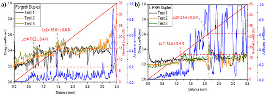 The adhesion of a coating is widely recognized as the most critical characteristic, as its relevance in any application is diminished if the material fails to adhere to the substrate. To delve into this essential property, we employed the dynamic scratching technique. This method enabled us to explore two pivotal aspects: the cohesive and adhesive loads at critical points (Lc1 and Lc2) and the overall separation of the coating, which correlates with the ultimate critical load (Lc3). Figure 6 shows the drag coefficient curves that were obtained from the three tests, including the load and acoustic signal versus the scratch distance for the forged/DUPLEX (Figure 6a) and the L-PBF/DUPLEX (Figure 6b).