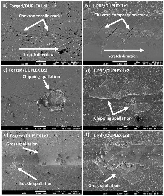 Selected areas of the scratch tracks at the distances where failures were obtained: (a) forged/DUPLEX Lc1, (b) L-PBF/DUPLEX Lc1, (c) forged/DUPLEX Lc2, (d) L-PBF/DUPLEX Lc2, (e) forged/DUPLEX Lc3, and (f) L-PBF/DUPLEX Lc3.