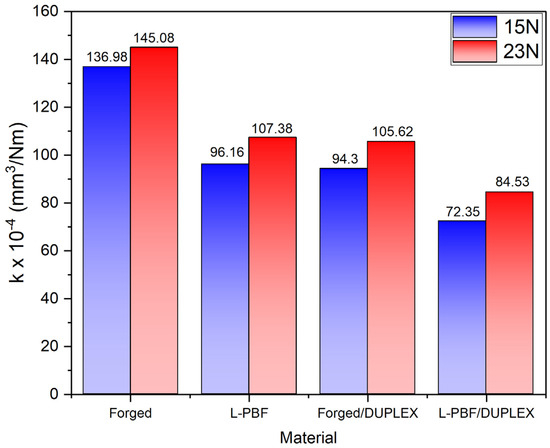 Figure 10 shows the wear coefficients for the forged and AM 17-4 PHH SS heat-treated and DUPLEX conditions. The thermally treated forged steel exhibits the highest wear coefficient, followed by the steel obtained by AM. However, upon applying the DUPLEX treatment, a decrease in the wear coefficient was observed for both materials, with reductions between 27% and 31% for the forged steel and between 21% and 25% for the steel produced by AM. The defects that were observed in the scratch tracks through confocal microscopy, which are related to the plastic deformation of the steel and lead to the appearance of instabilities in the COF, resulted in an increase in the material’s worn volume and, consequently, in the wear coefficient. Furthermore, the formation of a hardness gradient generated by the diffusion of nitrogen and the formation of iron nitrides in the nitriding process, which increases the intrinsic stress in both the substrate, the interface, and the deposited AlCrN layer, allows the surface to better distribute the stresses during scratching and reduce wear [44,45].