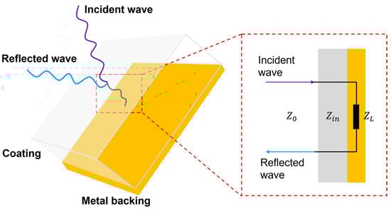 The widely used transmission line model represents single-layer homogeneous absorption coatings on a metal backing (Figure 1) [18,37]. The metal backing is treated as an ideal conductor with infinite conductivity. EM wave only penetrates its surface, resulting in complete reflection at the coating-metal backing interface. The metal backing is considered as a short-circuit load, represented by a load impedance of = 0. The propagation of EM wave occurs solely in the air and the coating, both acting as transmission lines. Unlike an ideal circuit, the EM wave dissipated while propagating through the air and the coating. The reflection loss (RL) of the circuit can be calculated by Equation (1) [18,37].