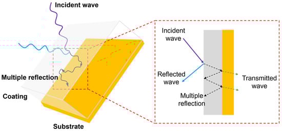 Multiple reflections occur if the coating is thin enough (Figure 2). A portion of the EM wave that has passed through the front interface reflects from the back interface and travels towards the front interface. Through the reflection process, the energy of the EM wave is dissipated. However, the dissipation becomes negligible when the thickness of the coating exceeds the skin depth, which is the distance below the surface of a shield where the intensity of the EM field decreases to 1/e of its initial value. The skin depth (δ) can be calculated by Equation (9) [21].