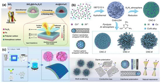 Scheme of (a) the preparation of gradient-structured Fe/C nanosphere [46], (b) the preparation and EM absorption mechanism of N-CNTs encapsulated Co/Ni [47], and (c) the preparation of Ag@SG [48]. Reprinted with permission from [46,47,48].