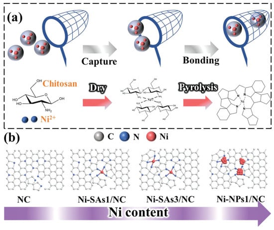 Scheme of (a) the preparation of Ni-SAs/NC and (b) the structure of NC, Ni-SAs/NC and Ni-SAs/NC. Reprinted with permission from [27].