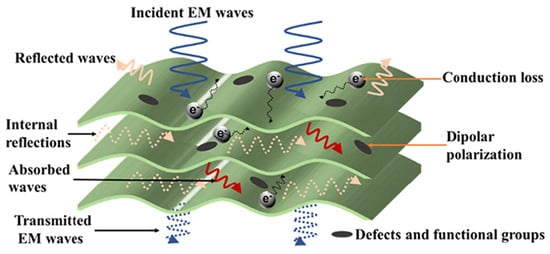 MXenes are a group of two-dimensional materials consisting of early transition metal carbides and carbonitrides [61]. These 2D materials are promising EM absorbers because of their high conductivity, permittivity and interfacial defects [62], which contributes to dielectric dissipation (Figure 8) [63].