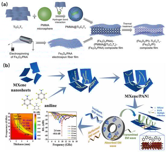 The preparation of (a) Fe3O4/polyimide/Ti3C2Tx [65] and (b) MXene/polyaniline [49]. Reprinted with permission from [49,65].