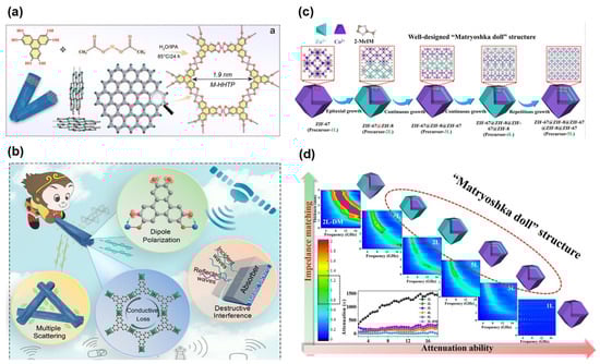 Scheme of (a) the structure of the HHTP derived MOFs, (b) the EM absorption mechanism of HHTP derived MOFs, (c) the structure of MOF@MOF and (d) the EM absorption mechanism of MOF@MOF. Reprinted with permission from [52,53].