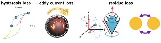Magnetic dissipation can be further divided into three parts, including hysteresis loss, eddy current loss and residual loss. The energy dissipated at a given frequency () can be expressed by Equation (5) [19].