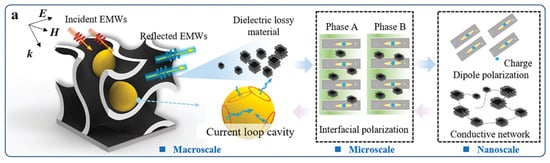 where is correlated to the conductive loss and is correlated to the polarization loss. is proportional to the electrical conductivity (), because when the EM wave propagates in conductive materials, electric current is induced and the EM energy is dissipated as Joule heat. Polarization loss can be further divided into interfacial polarization, dipolar polarization, and defect-induced polarization [40]. Interfacial polarization is associated with the interface of phases with different permittivity. Dipolar polarization is caused by the displacement polarization of nonpolar molecules and the orientation polarization of polar molecules in the EM field. Defect-induced polarization is related to defect sites such as vacancies and doping atoms.