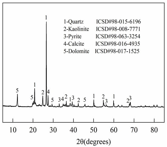 The experimental coal gangue is sourced from Ningwu, Shanxi, and its primary chemical components [32] include Al2O3, SiO2, Fe2O3, SO3, CaO, MgO, Na2O, K2O, P2O5, as shown in Table 1. The sample contains 2.19% sulfur (S), mainly in the form of pyrite. The total iron content (TFe) is 5.36%, indicating that it belongs to medium-sulfur coal gangue [33].
