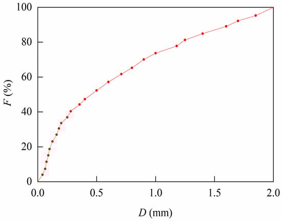 The raw coal gangue was crushed to a size of −2 mm using a jaw crusher and then sieved with a vibration sleeve sieve. A particle size distribution diagram was plotted, with the horizontal axis representing particle size and the vertical axis representing cumulative distribution, and the distribution type is shown in Figure 2.