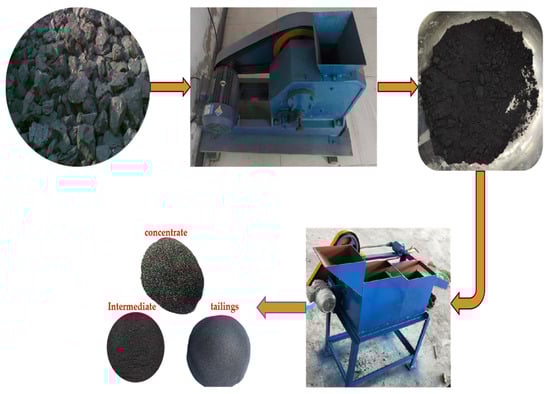 Coal gangue is a solid waste generated during coal mining [1], characterized by its low carbon content, which leads to a range of environmental issues due to its limited utilization and extensive accumulation [2,3,4]. Moreover, the presence of pyrite in coal gangue increases the risk of spontaneous combustion as sulfur easily oxidizes, further hindering comprehensive utilization [5,6]. On one hand, high-sulfur pyrite can be utilized for economic benefits through sulfuric acid production [7]. On the other hand, tailings devoid or containing minimal amounts of pyrite can be employed in building material manufacturing [8]. Therefore, the separation of pyrite in coal gangue is different from the ordinary descaling process. The ordinary descaling process is to separate impurities and make use of valuable concentrate or tailings. The pyrite concentrate and tailings produced by coal gangue separation have their utilization value, and the separation products can be fully utilized as resources, which is also an important reason for the comprehensive utilization rate of coal gangue to be improved [9].