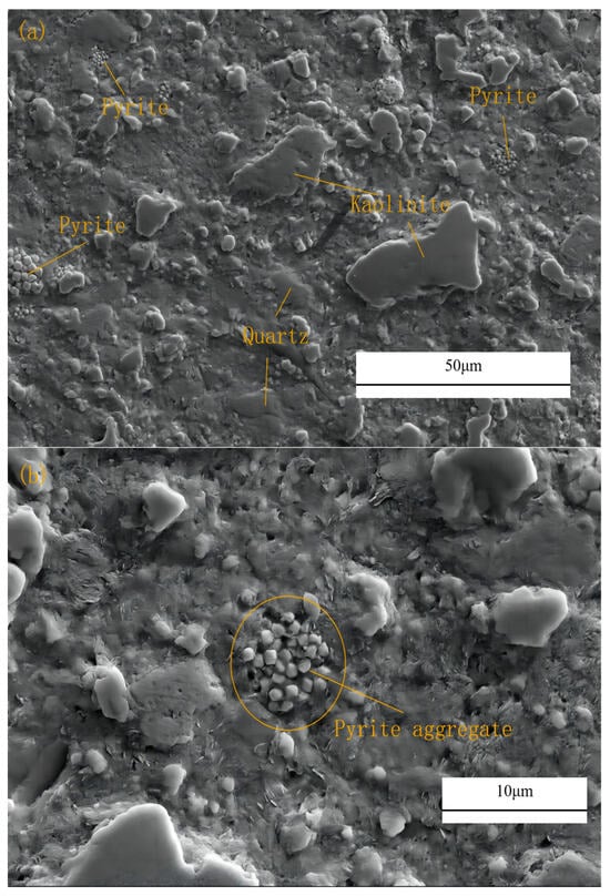 SEM image of coal gangue minerals. (a) Major mineral; (b) Pyrite.
