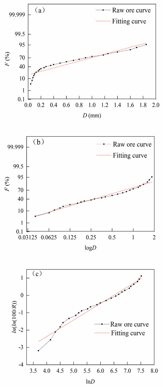 The study of the particle size distribution of fine powder has been applied in many aspects [27,28], but there are still few studies on jigging separation by particle size distribution. In view of this, taking coal gangue as the research object, the raw ore is crushed to −2 mm by a jaw crusher and sieved, and the cumulative distribution curve is drawn with the particle size as the horizontal coordinate, and the determination coefficient R2 [29,30,31] is used as the determination index to determine the distribution curve of the raw ore. According to the particle size distribution that the raw ore tends to meet, the parameters are changed to make the mass proportion of the material in each particle size range different, and the jig separation is carried out after the material is evenly mixed. This study revealed the separation effect under different parameter distributions, verified the influence of particle size distribution on jig separation, and provided a new beneficiation scheme for coal gangue separation.