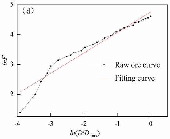 The grain size distribution of coal gangue was fitted with normal, lognormal, RRSB, and Fuller distributions, as well as the corresponding deterministic coefficients (R2) of 0.89567, 0.97157, 0.97297, and 0.93954, respectively, as shown in Figure 8. The lognormal distribution is commonly employed in theoretical analysis; however, it exhibits significant linear deviation when applied to particles with a wide range of sizes such as fine powder materials. In contrast, the RRSB and Fuller distributions provide more accurate descriptions for the original particle size distribution.