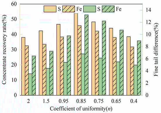 The uniformity coefficient n decreases, the fine mineral productivity decreases continuously, and the contents of S and Fe first increase and then decrease. The tail mineral rate increased continuously, and the contents of S and Fe first decreased and then increased. With the decrease in the n value, the recovery rate of the concentrate and the difference of precision and tail first increased and then decreased, and the inflection point appeared under the RRSB distribution of n = 0.85, as shown in Figure 11. When the n value is reduced to 0.85, the best separation effect is obtained, the difference between S and Fe content is 6.81% and 13.22%, and the tail mineral rate also achieves the effect of “tail throwing” by the jig. However, compared with the particle size distribution of raw ore, the separation effect of RRSB distribution based on different n values did not change significantly.