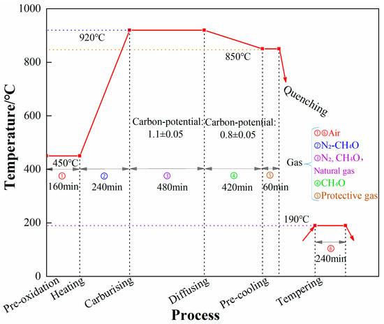 Figure 1 presents the heat treatment process curve for 22CrMoH. The specimen was preoxidized in a heating furnace at 450 °C and then preheated in a continuous-gas-heating furnace at 920 °C, to raise the temperature for precarburization. The entire carburization process consisted of three stages. The first stage was strong seepage, where the temperature was 920 °C and the carburizing gas was passed under a carbon potential of 1.15 ± 0.05%. In the second stage, the carburizing-furnace temperature was reduced to 850 °C for the diffusion of the carburizing gas at a carbon potential of 0.8 ± 0.05%. In the third stage, the carburizing gas was passed in a protective atmosphere at a carbon potential of 0.8 ± 0.05% under heat preservation at 850 °C. At the end of the carburization process, the gears were immersed directly into a quenching oil bath at 90 °C using a pusher device to quench them and achieve the adequate hardness and strength-enhancing organization. Finally, the gears were tempered in a tempering furnace at 190 °C to increase surface hardness and reduce residual stresses.
