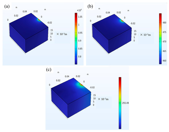 Cloud diagram of the cooling field distribution of the scanning electron beam: (a) t = 12.5 s, (b) t = 13 s, (c) t = 14 s.