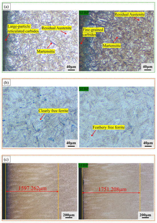 As can be seen in Figure 10a, the carbide particles of the SEBP specimens become reduced in size and that of austenite decreased and martensite is entirely class IV acicular. As the scanning electron beam roughened the surface and promoted the adsorption of C atoms on the surface, the carburite organization of the specimen increased close to the surface. The rapid heating and cooling of the scanning process resulted in the transformation of the austenite surface of the specimen into martensite [3]. This affected the organizational hereditary properties of the gas carburization, leading to a decrease in the volume fraction of austenite in the SEBP specimen. Figure 10b shows that the specimens with the SEBP showed insignificant free ferrite organization, which indicated that the scanning electron beam improved the organization at the heart for gas carburization. This complies with the need to limit the free ferrite content within the interface region of the heart adjacent to the carburized layer, especially for gear steel materials [27]. Figure 10c shows the depth of the carburized layer of the specimen, which increased in the same region for the SEBP specimen owing to the improved hardenability of the 22CrMoH steel by electron beam scanning [28,29], which enhanced the carburizing efficiency.