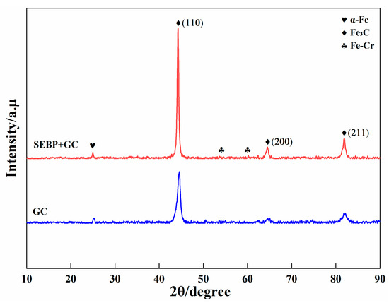 The XRD patterns of the GC specimens with and without SEBP are displayed in Figure 11. The carburized surface layer was mainly composed of the Fe-C phase [30], although the diffraction peaks of Fe3C are present in both samples. The XRD patterns showed diffraction peaks of crystal surfaces (110), (20 → 0), and (211) of both GC specimens, and the diffraction angles of the peaks are 44.3°, 64.4°, and 81.9°, respectively. The peaks of the Fe-C phase on the surface of the carburized specimens with the SEBP were enhanced. This is consistent with the microstructure of the cross-sectional surface.