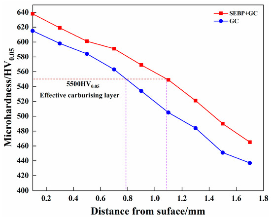 Figure 13 shows the cross-sectional microhardness of GC specimens with and without SEBP. The hardness decreases gradually, cross-sectional hardness of the specimen increases, and the hardness gradient decreases slowly. In addition, under the same conditions of the gas-carburizing process, a greater depth of the carburized layer is obtained. When the depth of the carburized layer increases from 0.78 mm to 1.09 mm, the carburizing efficiency increases by almost 39%. The depth of the carburized layer is determined by its distance from the surface at a hardness of 550 HV0.05.