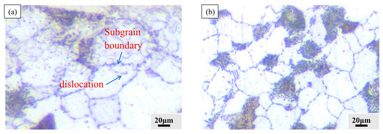 Figure 8 shows the curve for the cross-sectional hardness of the specimen after scanning with the electron beam. The surface layer of the specimen was found to be strengthened, i.e., the surface hardness increases noticeably and is 89 HV greater than that of the substrate. However, the hardness in the region having a thickness of ~110 μm increases to different degrees, indicating that the scanning electron beam caused thermal deformation of the surface layer [26]. The microhardness, degree of deformation, and density of dislocations were higher at a distance closer to the surface, as shown in Figure 9. As the distance from the surface increased, the microhardness decreased slowly and reached the non-deformed region, where the hardness was the same as that of the matrix.