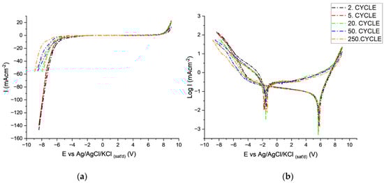 Cyclic voltammograms (2, 5, 20, 50, and 250 cycles) obtained on AAO in the potential range of +/−10 V and 100 V/s scan rate in 0.2 M H2SO4N + 0.1 M SnSO4 + 0.05 M stabilizer solution at 24 . (a) E-i and (b) E-Logi scales.