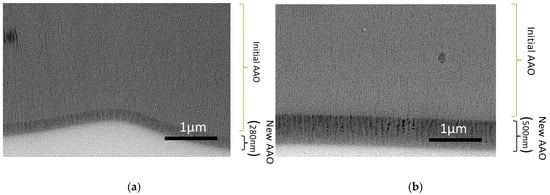 Before anodization, high-purity aluminum sheets (99.995%, 0.7 mm-thick, GoodFellow, Cambridge, UK) were annealed at 450 for 3 h to obtain the ordered nanostructure after two-step anodization [30,31]. Annealed samples (20 mm × 80 mm in size) were then electropolished in 80%v phosphoric and 20%v sulfuric acid solution at a constant voltage of 17 V for 5 min at 70 . First, anodization was performed by applying 16 V DC at 19 in a 1.7 M H2SO4 solution in a conventional two-electrode cell with an aluminum counter electrode for 30 min. After selectively dissolving the AAO layer in 0.25 M chromic acid solution at 70 for 4 h, a second anodization step was performed under the same conditions. In these experiments, only one face of the aluminum was exposed to the anodization solution by masking the other surface with cellulosic lacquer. During this step, the anodization time was increased to obtain an AAO thickness of 40 µm. Increasing AAO thickness is crucial to obtaining a free-standing AAO layer after the selective dissolution of remnant metallic aluminum below the AAO layer.