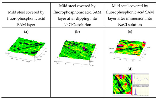 Figure 1. Demonstration of general and pitting corrosion by atomic force microscope: mild steel with fluorophosphonic acid self-assembled layer (SAM) (a); after immersion into NaClO4 solution for 1 h (b); after immersion into NaCl solution for 1 h (c) and its section; (ac): 3D; section imaging (d); (0.1 M NaClO4; 3% NaCl; room temperature).