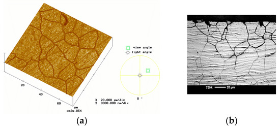 Figure 4. View of a polished material attacked by intergranular corrosion; (a) surface visualized by AFM in 3D; (b) microscopic visualization of cross-section [2].