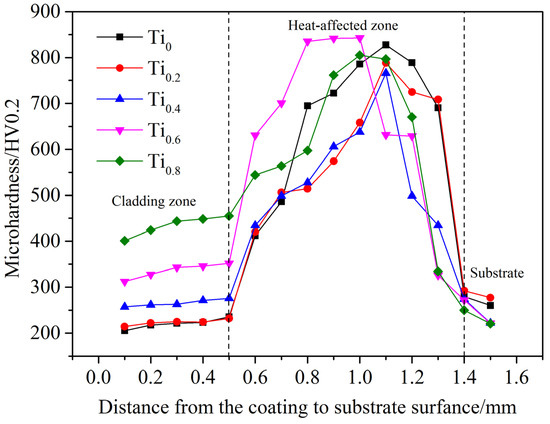 Figure 5 illustrates the microhardness distribution curves of laser-cladded CoCrFeNiMnTix HEA cladding coating with different Ti contents. Along the depth profile from top to bottom of cladding coating, the coating delineates into distinct zones: the cladding zone, the heat-affected zone, and the substrate. As can be seen from the Figure 5, with the increases in Ti content, the hardness of the cladding coating gradually increases, and the hardness of the cladding zone is greater than that of the substrate, the hardness of the heat-affected zone is greater than that of the cladding zone. With increasing Ti content, the average hardness value of the cladding zone ascends from 230.46 HV to 453.38 HV, reaching a peak of 823 HV in the heat-affected zone. This phenomenon primarily arises from two factors according to the previous microstructure and energy spectrum analysis. On the one hand, the evident grain refinement effect within the cladding coating as Ti content rises, synergizing with the inherent benefits of laser cladding itself, thus accentuate the refinement strengthening effect. On the other hand, the atomic radii of Co, Cr, Fe, Ni, Mn, and Ti are 125 pm, 124 pm, 124 pm, 121 pm, 124 pm, and 145 pm, respectively, the largest atomic radius of Ti element in contrast to other alloy element constituents accentuates lattice effects, bolstering solid solution strengthening and consequently enhancing the microhardness of the cladding coating. This result is accordance with Liang et al. [36], who used laser cladding to manufacture the CoCrFeNiMoTix coatings and discovered that when the Ti concentration hits 0.75 at.%, the coating’s average hardness peaks at 950 HV.