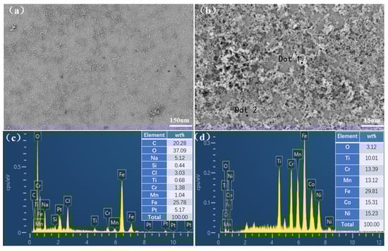 Corrosion morphology and EDS results of CoCrFeNiMnTi0 HEA cladding coating: (a) 100×; (b) 1000×; (c) EDS result of Dot1; (d) EDS result of Dot2.