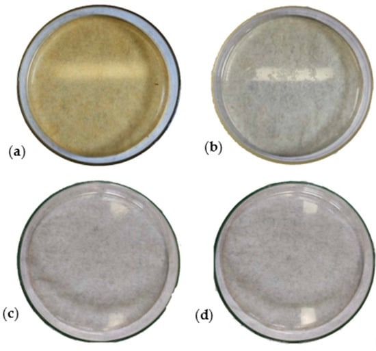 The permeability index of the samples was assessed by gravimetrically incorporating slight modifications to the method outlined in []. Silica gel was placed within a glass jar, which was then sealed using a 6 cm diameter piece of coating, covering the jar’s opening. The film was secured in place with parafilm, and the jar was placed in an environment maintained at 90% relative humidity (RH) and 20 °C. The weight of the jar was recorded every 24 h until a consistent weight gain was observed []. The permeability index was subsequently calculated using the following equation: