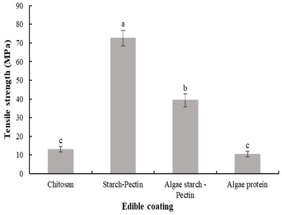 Tensile strength of edible coatings. Mean ± standard deviation with the same letter indicates no significant difference (p > 0.05).