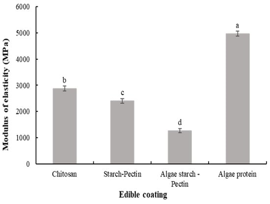 Modulus of elasticity of edible coatings. Mean ± standard deviation with the same letter indicates no significant difference (p > 0.05).