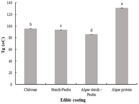 Conversely, the lowest Tg was manifested from the starch alg./pectin coating, with a significant difference, a phenomenon linked to the composition of starch. Starch, featuring both branching and linear amylopectin chains, tends to adopt a more amorphous structure with fewer secondary structures []. This inherent molecular arrangement renders the starch alginate/pectin coating more susceptible to thermal transitions at lower temperatures.