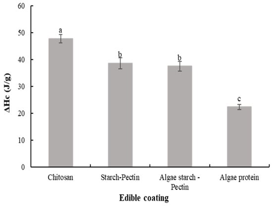 Enthalpy of crystallization of edible coatings. Mean ± standard deviation with the same letter indicates no significant difference (p > 0.05).