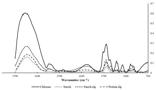 FTIR analysis of coatings: chitosan, starch, starch alg. and protein alg.