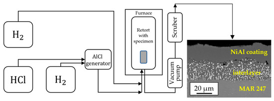 - Inceyer, A.A.; Güven, G.; Demiralay, K.; Zeytin, H.K.; Usta, M. The Effects of Chemical Vapor Aluminizing Process Time and Post-processing for Nickel Aluminide Coating on CMSX-4 Alloy. J. Mater. Eng. Perform. 2022, 31, 2341–2353. [Google Scholar] [CrossRef]