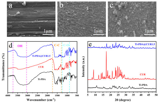 SEM images (a–c), FTIR spectra (d), and XRD (e) of Ti, Ti-PDA, CUR, and Ti-PDA@CUR1.5.