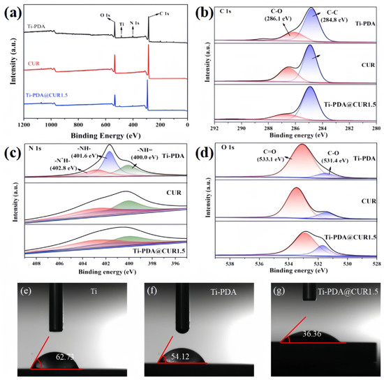Finally, the chemical composition of CUR, Ti-PDA, and Ti-PDA@CUR1.5 was investigated by XPS, and the survey spectra prove the coexistence of Ti, C, N, and O [34,41] (Figure 4a). The high-resolution spectra of C 1s could be fit with three peaks at ca. 284.8 eV and 286.1 eV, corresponding to C–C and C–O, respectively (Figure 4b). The deconvoluted peaks at ca. 400.0 eV, 401.6 eV, and 402.8 eV can be observed in the spectrum of N 1s (Figure 4c), which are attributed to -–NH=, –NH–, and –N+H–, respectively, where the –NH– bond serves as the connection between PDA and CUR [37]. Additionally, C=O and C–O bonds can be detected at 531.3 eV and 533.1 eV in the spectrum of O 1s (Figure 4d). According to Yan’s calculation method [33], compared with Ti-PDA, after coating CUR, the content of C–C bonds (59.4–28.1 eV) and C=O bonds (9.1–6.9 eV) decreased, and the content of –NH– bonds increased (31.8–67.2 eV) in Ti-PDA@CUR1.5, further indicating that the Ti-PDA@CUR composite was successful and there was a strong interaction force between them. Finally, the water contact angle of Ti-PDA and Ti-PDA@CUR1.5 was measured to test the hydrogen bond between the catechol group in CUR and PDA because the stronger the hydrophilicity, the stronger the hydrogen bond. The result shows that the order of the water contact angle is as follows: Ti (62.73°) > Ti-PDA (54.12°) > Ti-PDA@CUR1.5 (36.36°), which is consistent with the results presented above (Figure 4e–g).