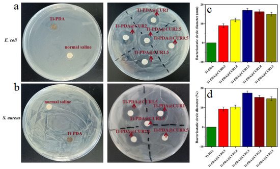 As shown in Figure 6a,b, compared with Ti-PDA, all Ti-PDA@CURx (x = 0.5, 1.0, 1.5, 2.0, 2.5) show a significant antibacterial circle. Consistent with the bacterial inhibition rate result, the diameter of the antibacterial ring shows an initial increase followed by a decrease with the increase in CUR content. More specifically, the diameter of the antibacterial circle against E. coli and S. aureus for Ti-PDA@CUR0.5, Ti-PDA@CUR1, Ti-PDA@CUR1.5, Ti-PDA@CUR2, and Ti-PDA@CUR2.5 is 9/9.3 mm, 12/10.3 mm, 17/17.5 mm, 16.3/15.3 mm, and 15/14.6 mm, respectively, where Ti-PDA@CUR1.5 exhibits the best antibacterial properties (Figure 6c,d). This may be because the phosphorylated groups with protonated amino groups in Ti-PDA@CUR interact electrostatically with phospholipid components of the cell membrane, potentially hindering bacteria from absorbing nutrients and multiplying [46].