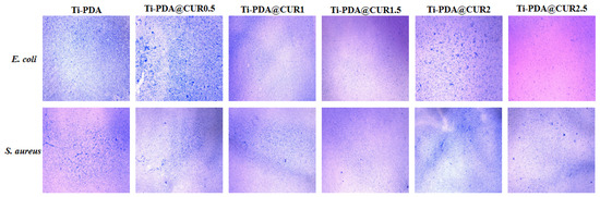 In clinical practice, E. coli and S. aureus are frequently encountered as pathogenic bacteria, and they tend to form bacterial biofilms at the site of infection [47]. In this experiment, the effects of antimicrobial susceptibility tablets on E. coli and S. aureus on bacterial biofilm formation were evaluated. As shown in Figure 7, the crystal violet color of the Ti-PDA@CUR sample became lighter compared with the Ti-PDA sample, and as the CUR content increased, it can be clearly seen that the crystal violet color of E. coli and S. aureus first lightened and then deepened. The color of E. coli in the Ti-PDA@CURx (x = 0.5, 1.0, 1.5, 2.0, 2.5) experimental groups first became lighter and then darkened. The color of S. aureus in the Ti-PDA@CURx (x = 0.5, 1.0, 1.5, 2.0, 2.5) experimental groups first became lighter and then darkened. At a loading drug concentration of 1.5 mg/mL, bacterial crystal violet was the lightest in color. This may be due to the saturation of hydrogen bond adsorption between 1.5 mg/mL CUR and Ti-PDA, which has the greatest electrostatic effect and prevents the reproduction of bacteria, so the antibacterial effect is the best.