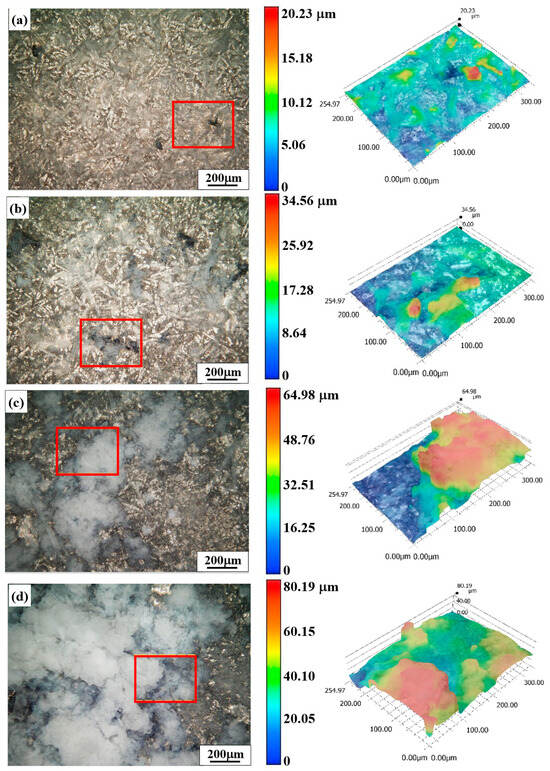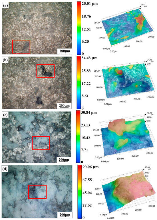 Surface morphologies and 3D profiles of AEO-coated samples after being soaked in 3.5 wt.% NaCl solution for: (a) 2, (b) 6, (c) 16 and (d) 24 h. The locations of 3D profiles are squared by red frames in images (a–d).