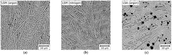 The LSA process on the DCI’s surface caused in situ metal–matrix composite microstructure formation in the surface layers, in which the matrix was composed of primary austenite dendrites transformed to martensite and ledeburite in the interdendritic regions, which is similar to the LSM surface layers’ microstructure. Depending on the process parameters (mainly titanium powder feed rate) the cubic or dendritic phases precipitated from the liquid metal during crystallization. The EDS and XRD analyses proved that those precipitates were titanium carbides or titanium carbonitrides for the process being carried out in an argon or nitrogen shield, respectively. In general, the analyzed process parameters produced homogeneous in situ metal–matrix composite surface layers reinforced by 5.5–20.1 vol.% of TiC precipitate and 4.8–10.1 vol.% of TiCN precipitate for the argon and nitrogen shields, respectively. With a titanium content increase in the liquid metal pool, the TiC(N) precipitate fraction increased. In comparison to LSM processes, the cementite fractions are lower for LSA surface layers. The cementite fraction also decreased with titanium content increases. This is due to the order of phase formation during cooling of liquid metal in the Fe-Ti-C and Fe-Ti-C-N systems [32,33,34,35,36]. The lower Gibbs free energy for TiC and TiCN resulted in the formation of those phases from the liquid metal first during cooling. With the increase in the titanium content and simultaneous increase in the TiC(N) precipitate fraction, the carbon content in the remaining liquid decreased, which resulted in a lower cementite fraction in the matrix. The titanium content did not affect the retained austenite fraction.